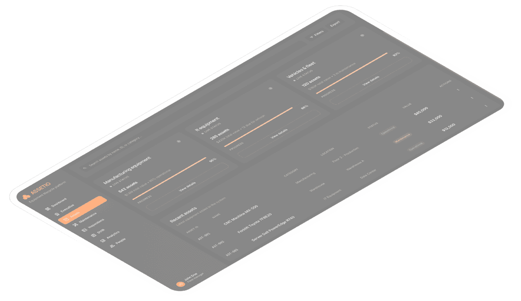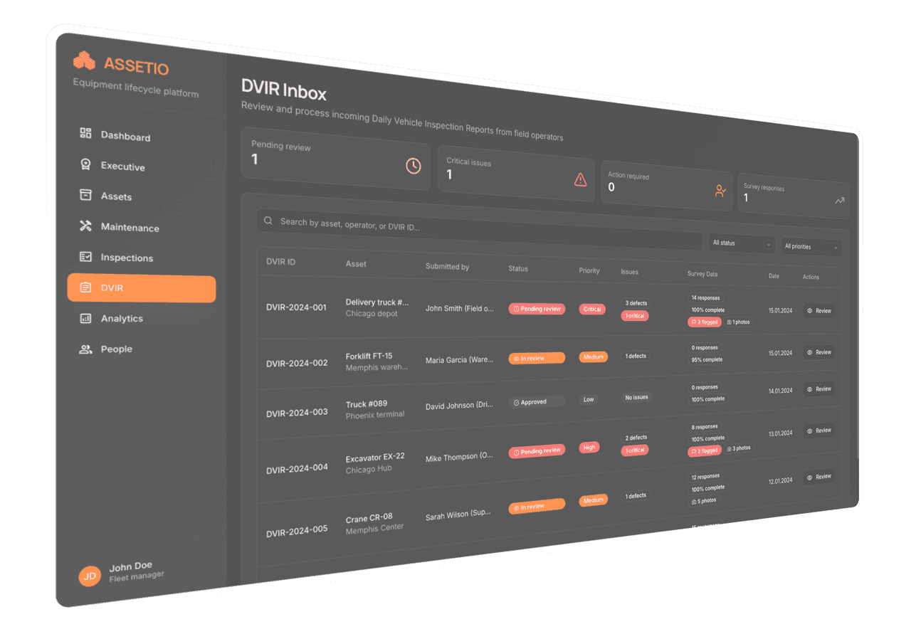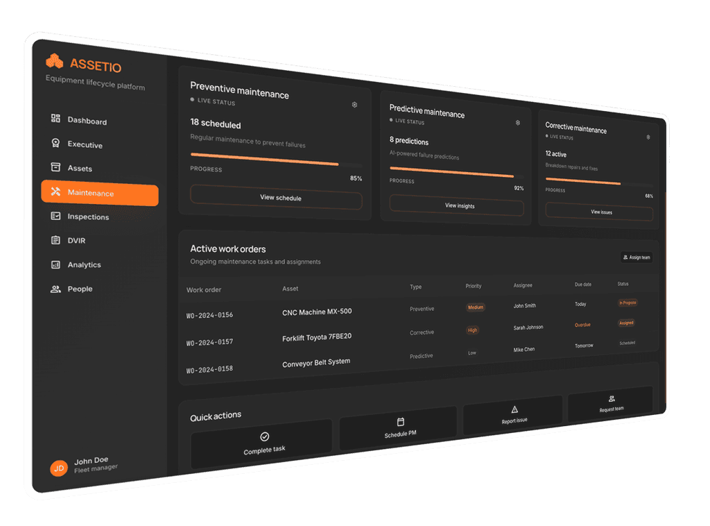 Assetio is a comprehensive asset management and maintenance platform designed for organizations that need to track, maintain, and optimize equipment, vehicles, and infrastructure. It’s a B2B SaaS product used by a parent company based in the US, with applications across manufacturing, logistics, and facility management. The platform supports more than 1,200 assets across 23+ sites with AI-powered maintenance, DVIR workflows, and advanced analytics.
