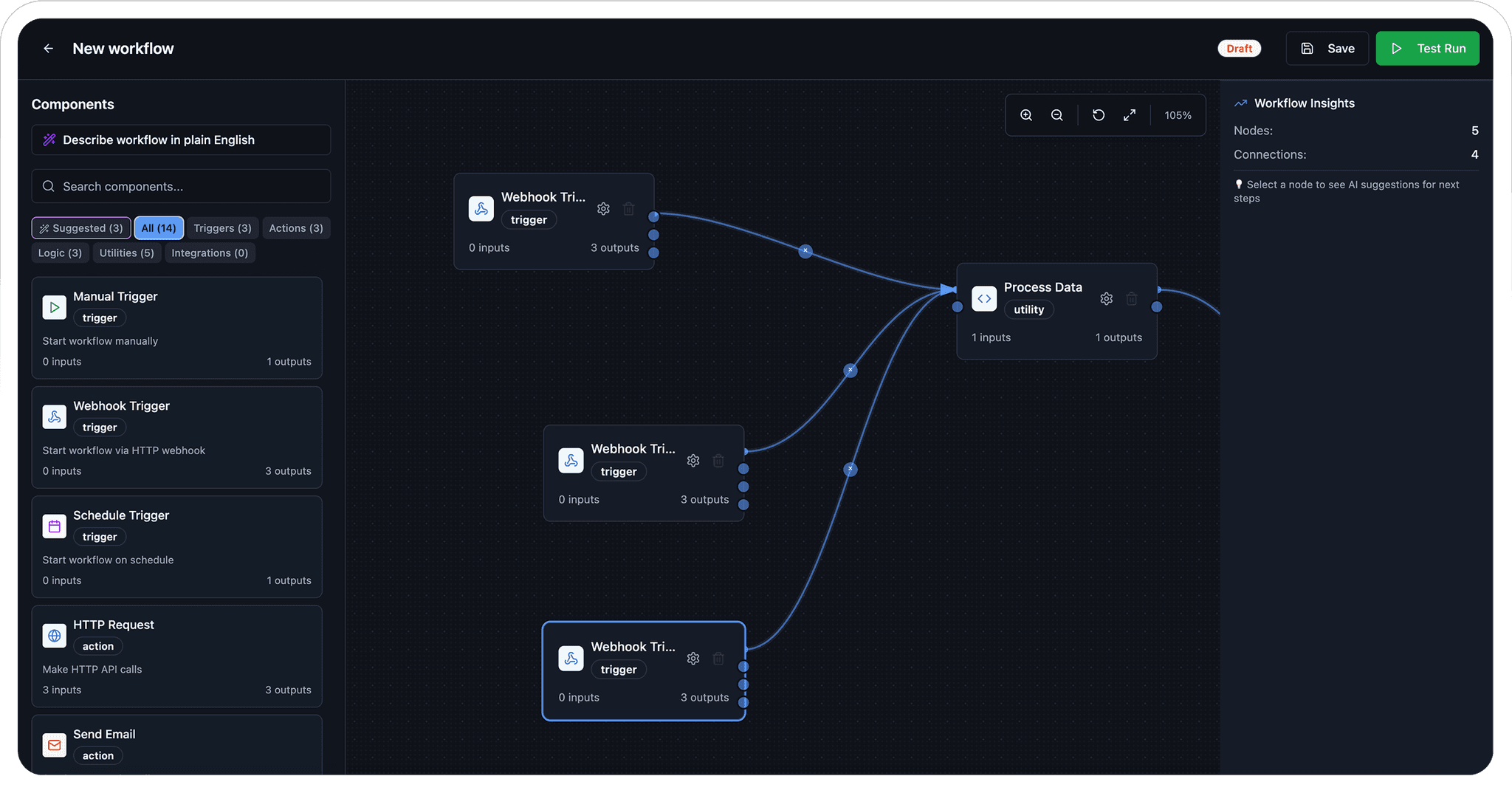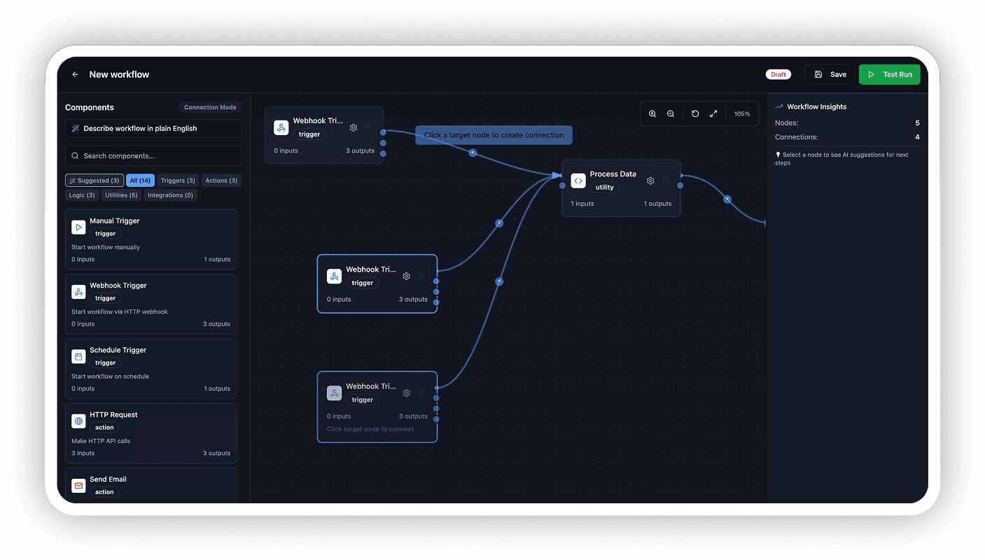 Visual drag-and-drop workflow builder with over 20 node types