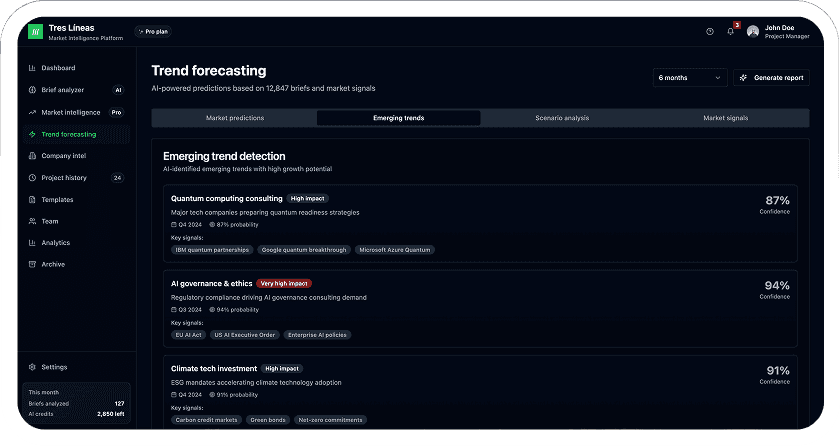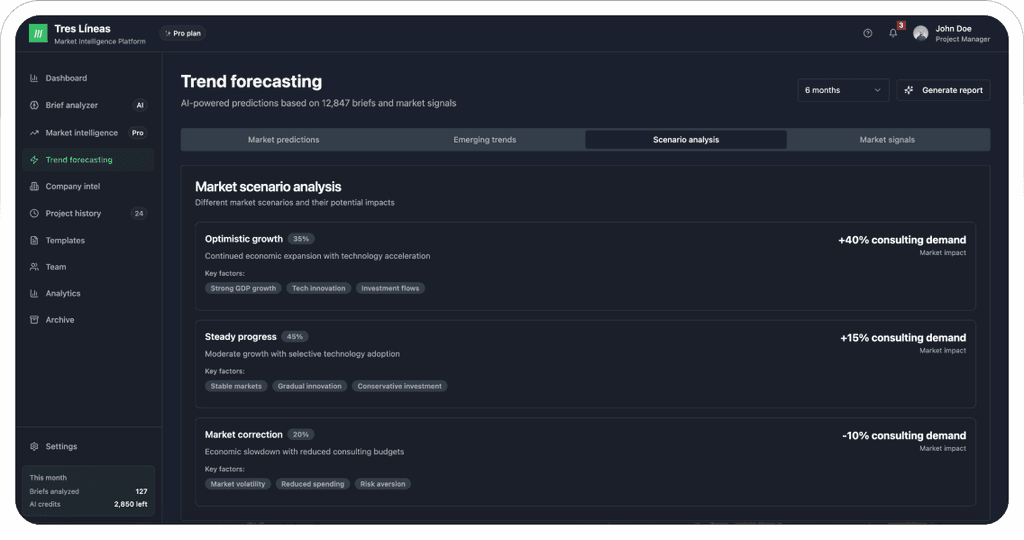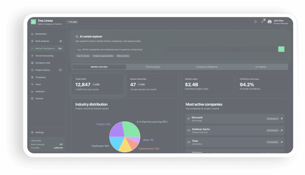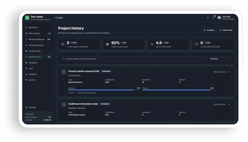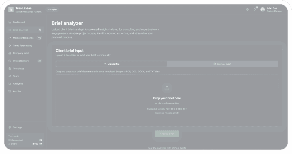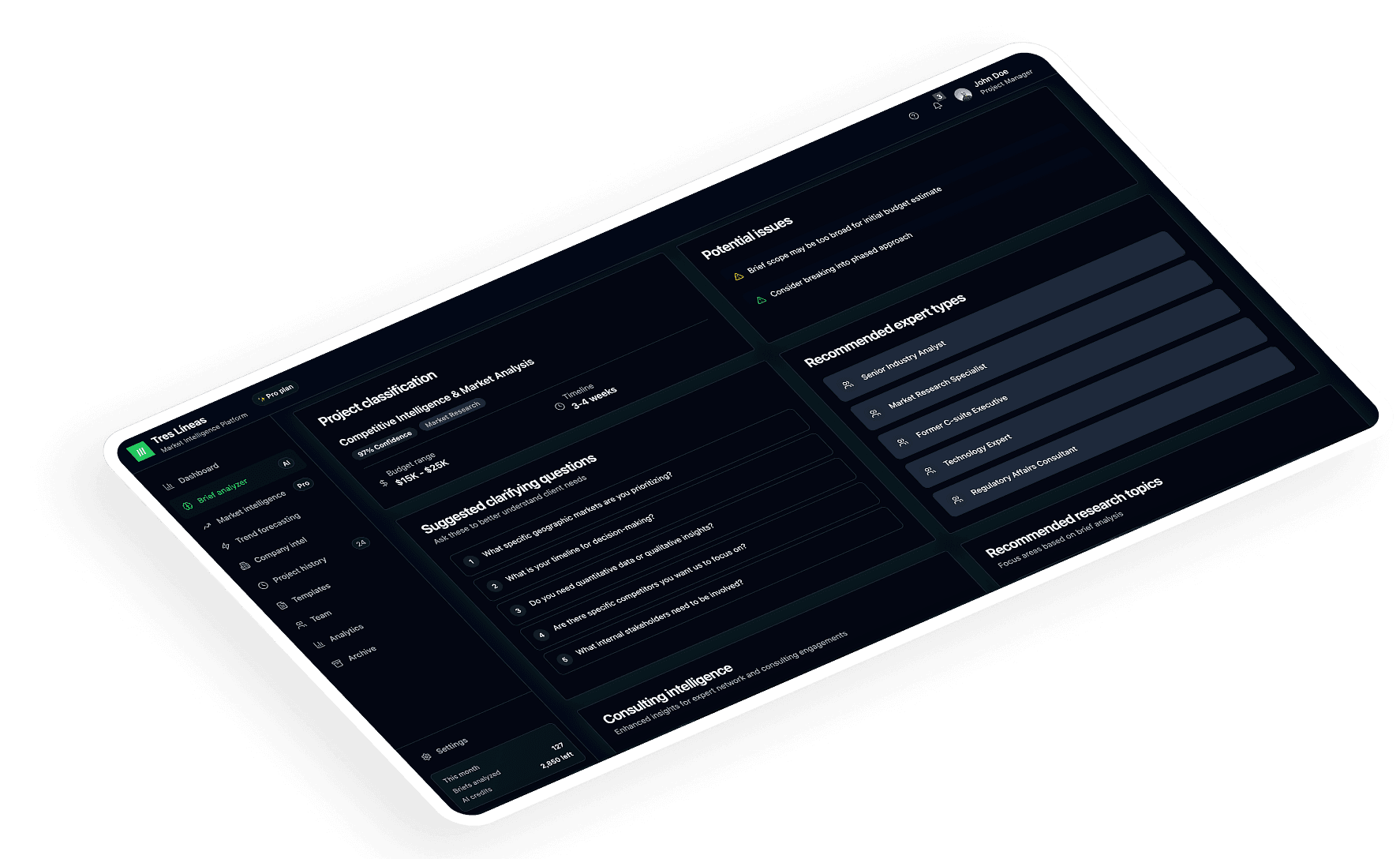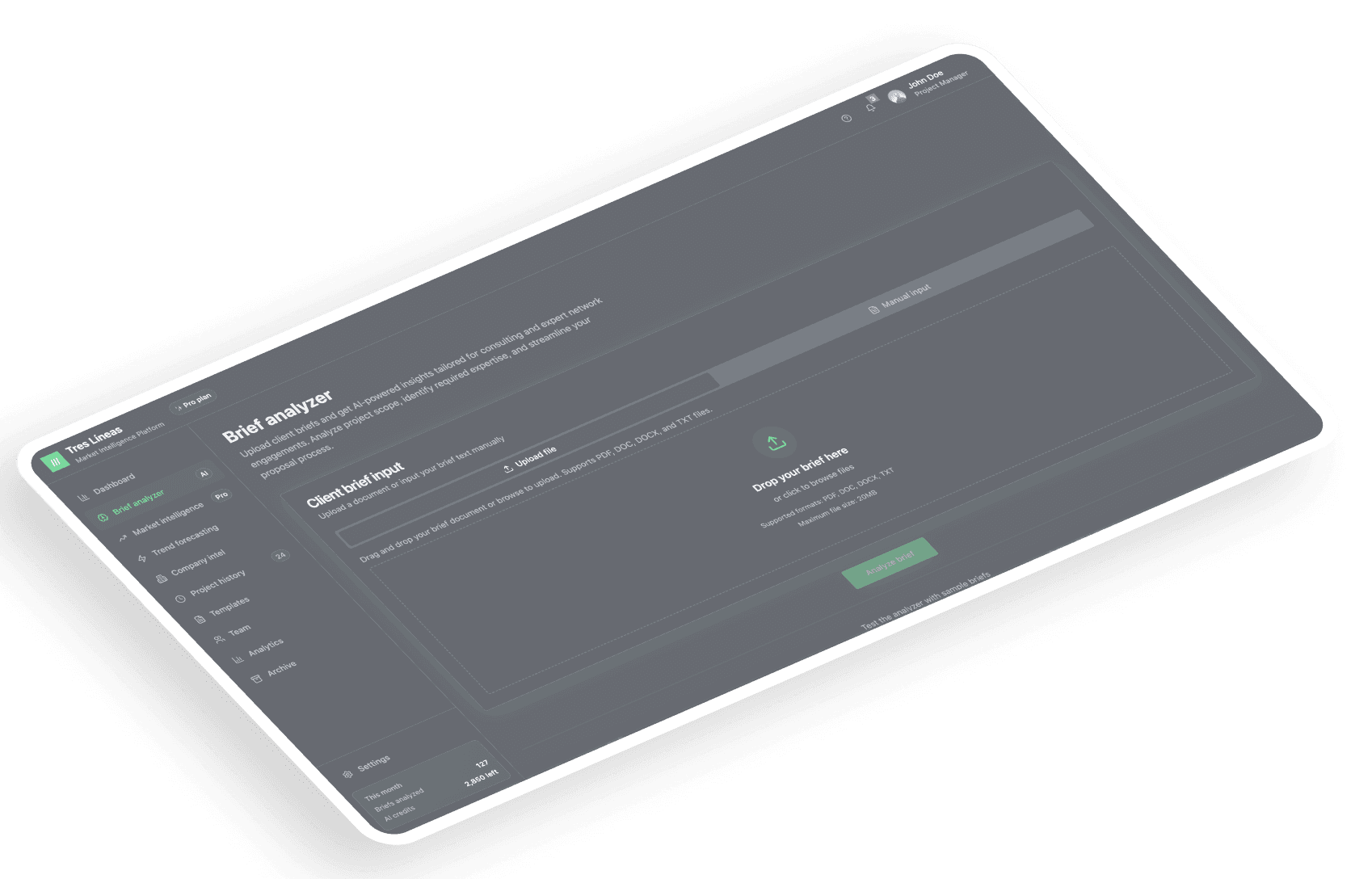 Tres Líneas is an AI-powered Market Intelligence Platform created for consulting firms and expert networks. It was founded by a team of professionals with experience in the expert network industry, particularly from a Spanish office of a major global player. The platform is designed to turn consulting briefs into actionable business intelligence — dramatically improving how consulting teams process, analyze, and act on project requests. The founders approached Uxion to help them build a fully testable MVP to raise their first round and validate their product vision with early users and investors.