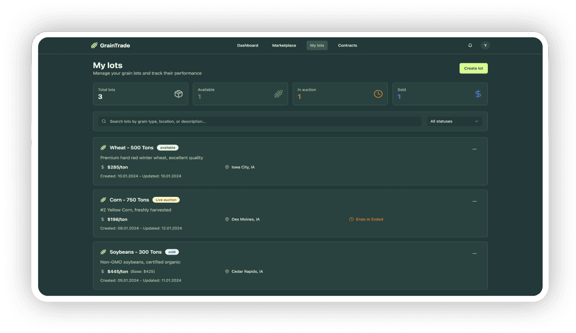 Grain inventory and bidding workflows