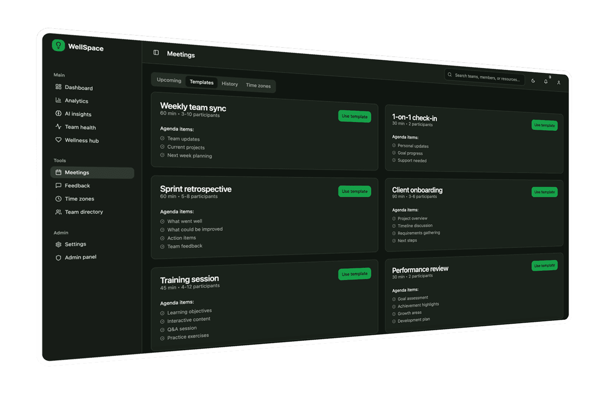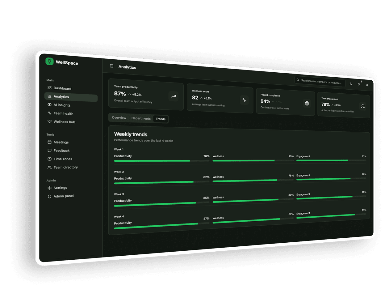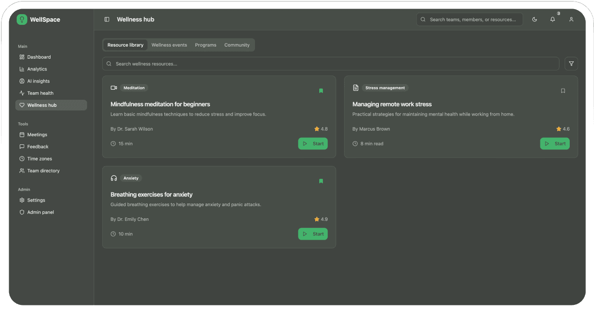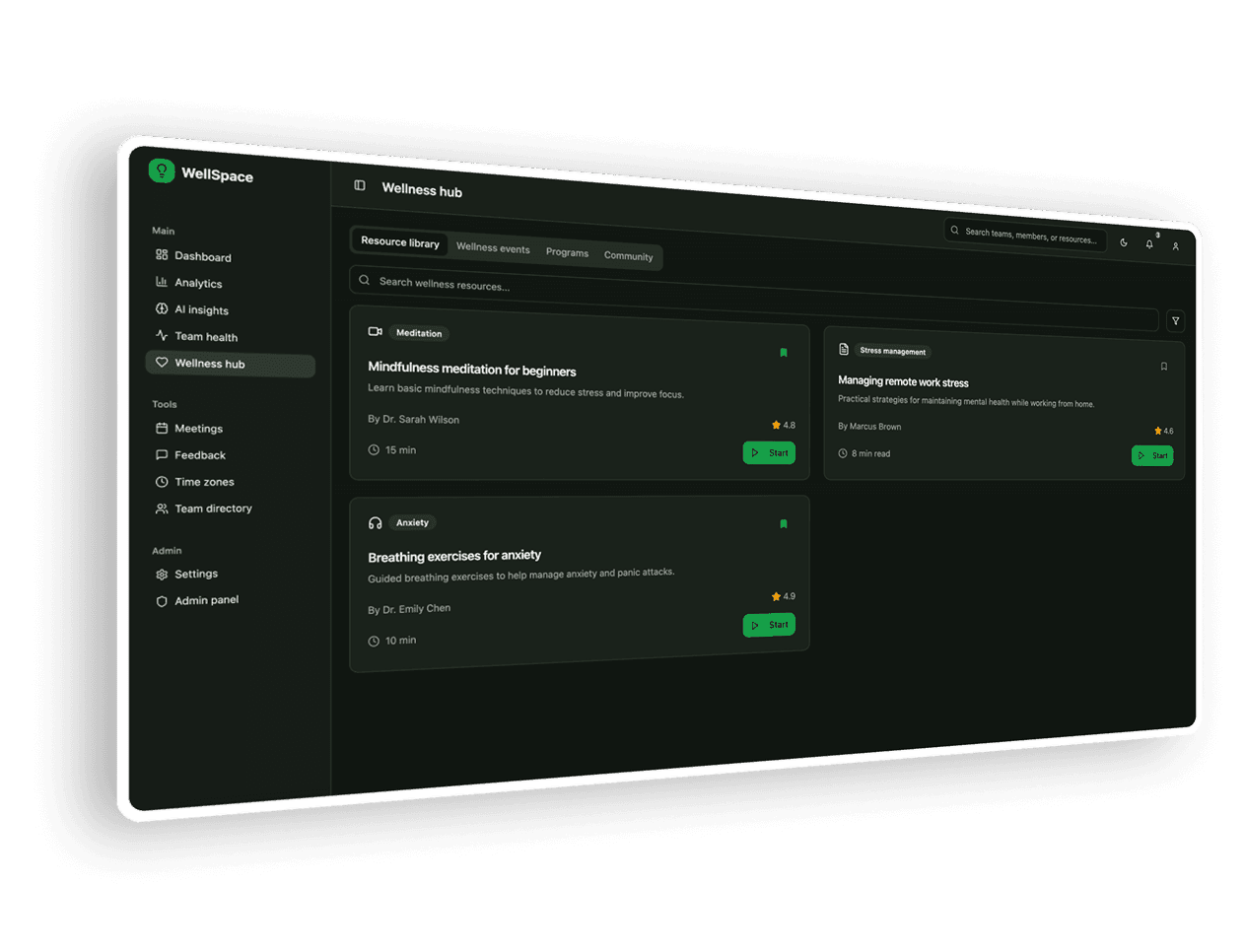 WellSpace is a wellness and mental health management platform developed by a leading Ukrainian IT company aiming to enter the US market. The product focuses on helping organizations monitor and improve employee well-being using AI-powered analytics, predictive insights, and wellness-focused programs. The team needed to move fast – from MVP to real user feedback – while maintaining a polished and calm design system that resonates with HR, leadership, and employees.